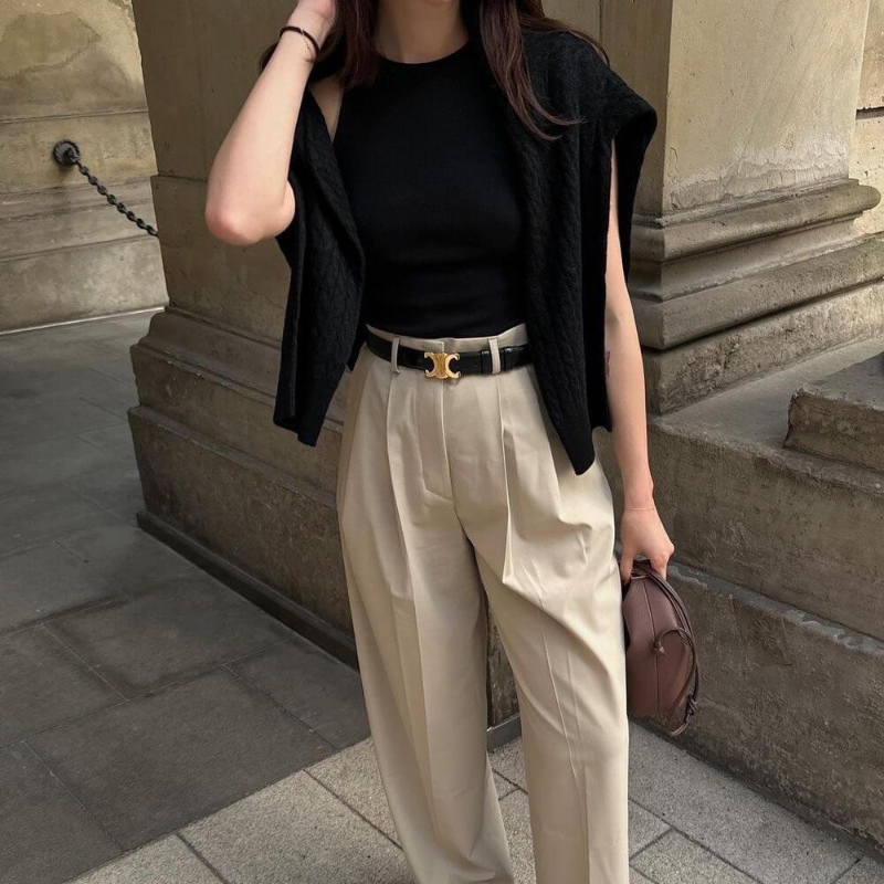 Der Riemen besitzt eine glatte Oberfläche mit sichtbaren Nahtlinien entlang der Kanten und behält über die gesamte Länge eine gleichmäßige Stärke. Das ausgewogene Design verleiht dem Gürtel ein zeitloses.