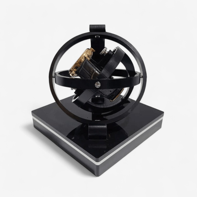 Der AureoWind-Uhrenbeweger besticht durch ein elegantes, quadratisches Gehäuse mit transparenter Frontscheibe und hochglänzender Oberfläche. Im Inneren befindet sich ein zentral platzierter, rotierender Halter, der die Uhr während des Betriebs sichtbar präsentiert.
