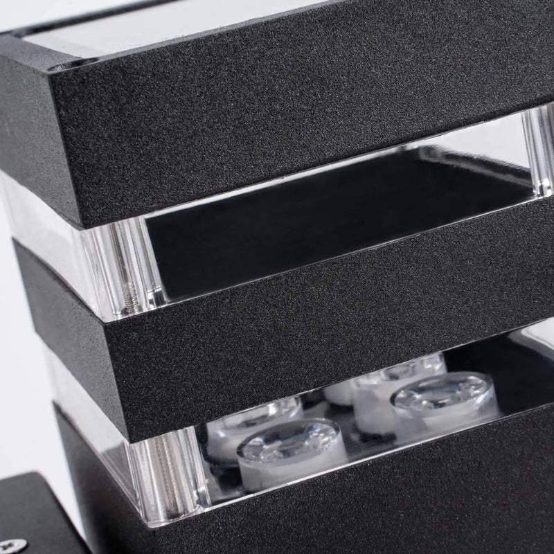 Die LumiVault-Wandleuchte ist mit einer rechteckigen Struktur gestaltet, die sich ideal für den Außenbereich eignet. Der Rahmen bewahrt gerade Linien mit einer ausgewogenen Kontur, während die Verbindungen zwischen Körper und Abdeckung schlicht und sichtbar bleiben.