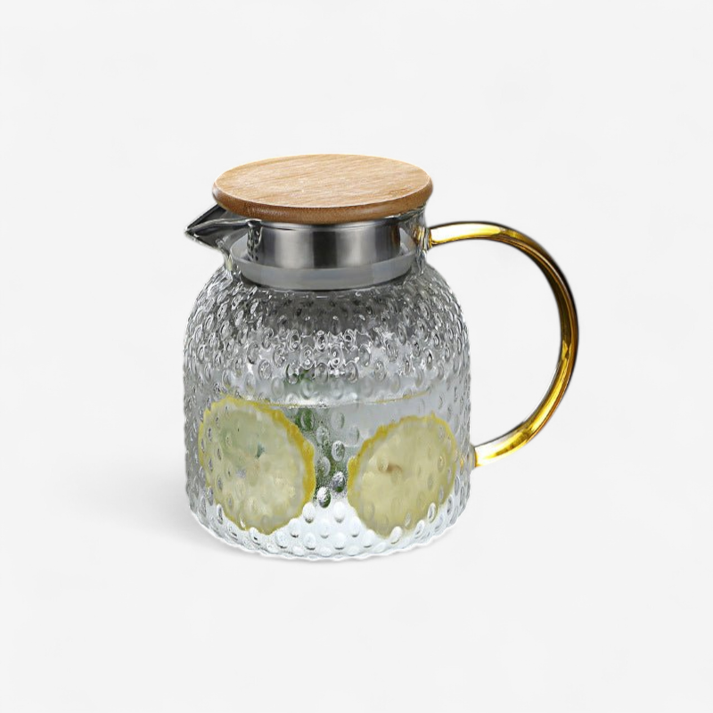 Der Bambusdeckel ist mit zwei Ausgießoptionen ausgestattet – einer offenen und einer mit Filtereinsatz – und ermöglicht so das einfache Ausschenken von Getränken mit oder ohne Früchte und Eis. Der klare Glaskörper behält ein ausgewogenes, minimalistisches Design bei, das sich harmonisch in jede Umgebung einfügt.