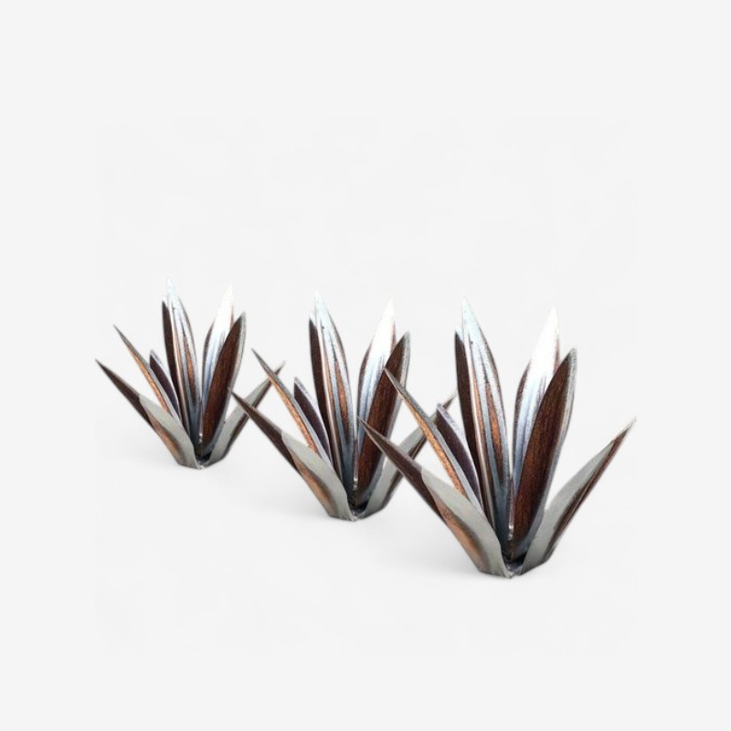 Die VerdaBloom Skulptur zeigt eine dreidimensionale Agavenform mit strukturierten, gestaffelten Blättern. Der rostfreie Metallkörper betont die natürliche Form und erzeugt ein skulpturales, optisch ansprechendes Design.